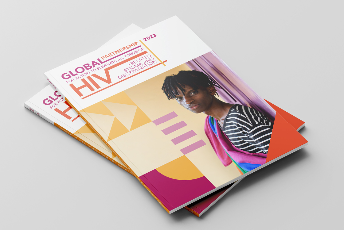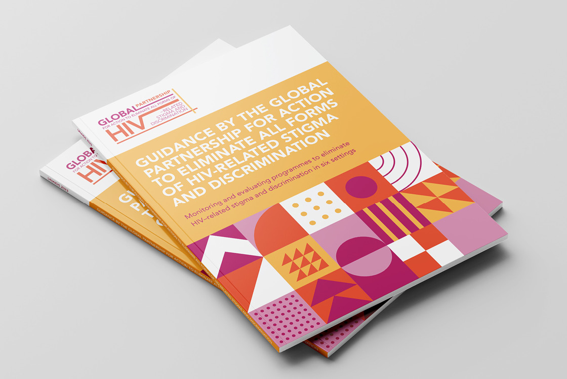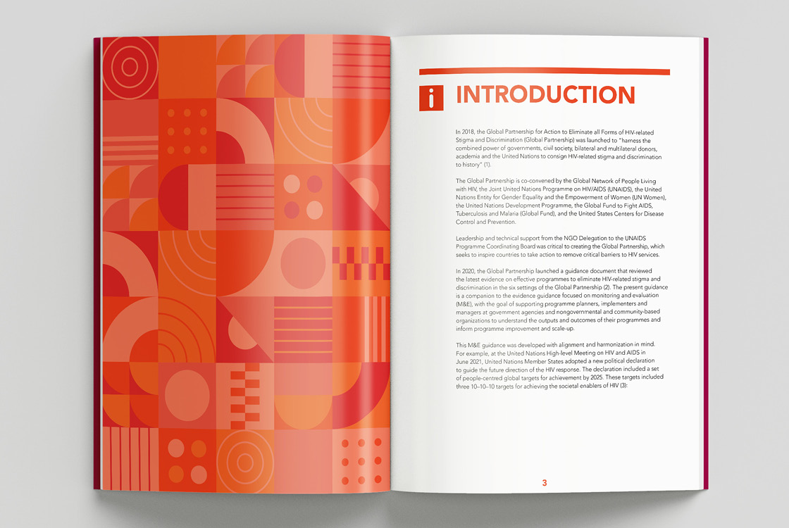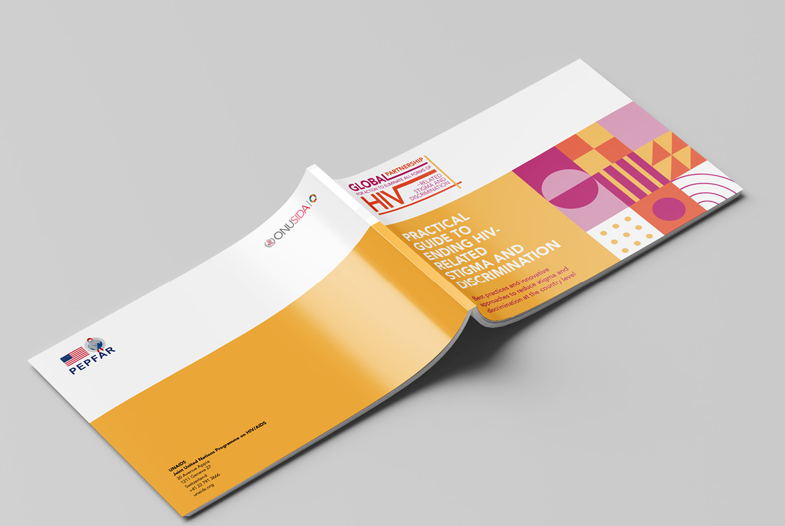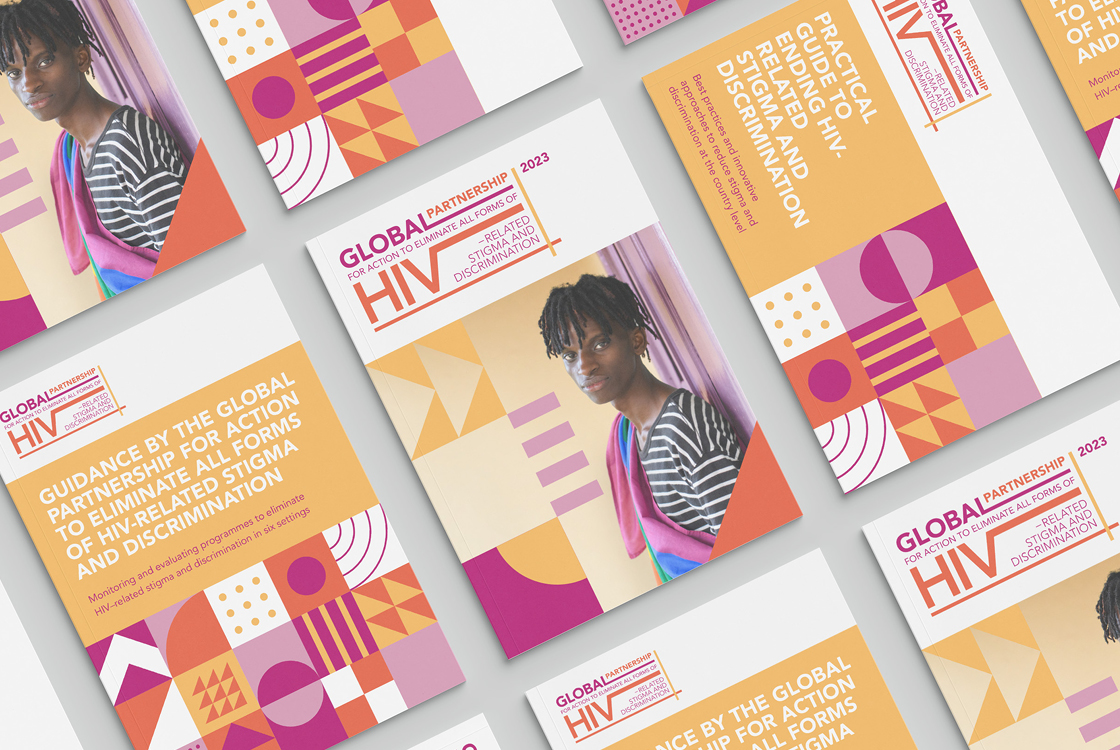 The Global Partnership to Eliminate All Forms of HIV-Related Stigma and Discrimination is an initiative of 10 UN agencies and 24 civil society organizations. We were approached with the task of creating a small visual identity that is based on the corporate identity of UNAIDS, but still has its original and recognizable character. The initiative does not use its own logo because it operates under UNAIDS, instead of the logo it has a distinctive Wordmark. The entire identity is built on playful and bold geometric compositions and 3 positive colors. Our studio also produced three publications in several world languages.