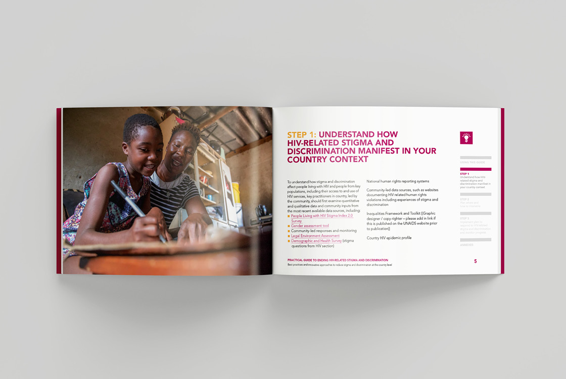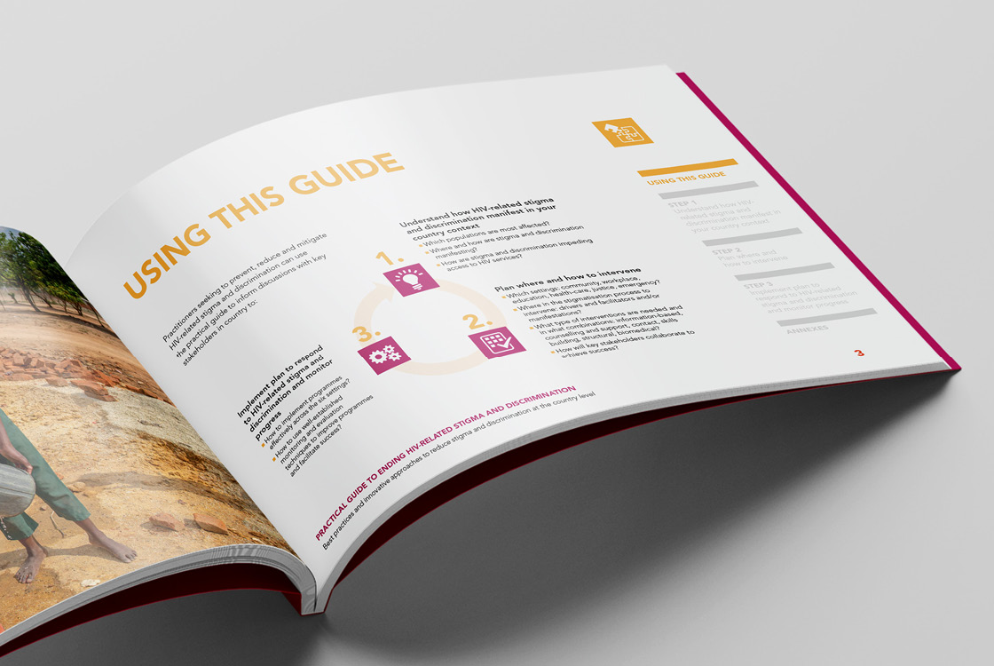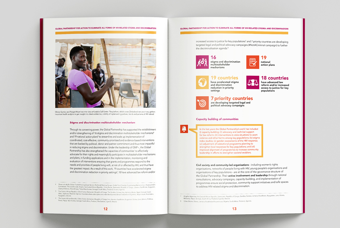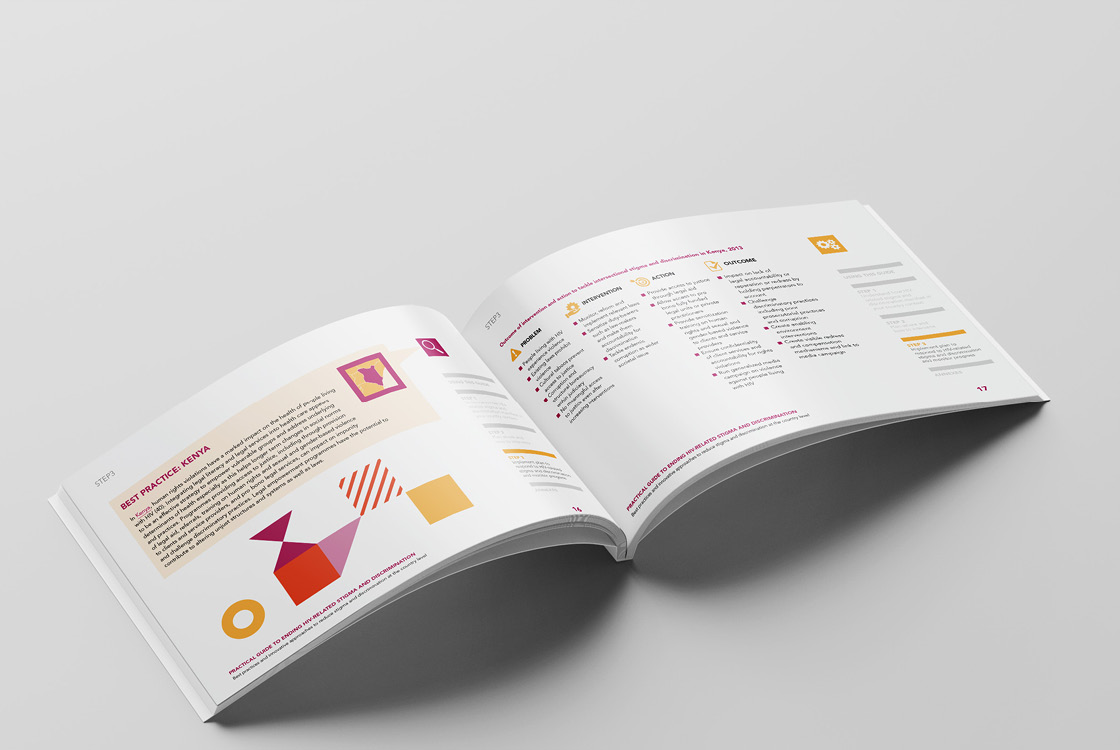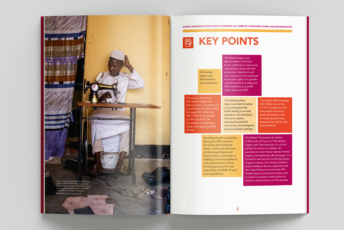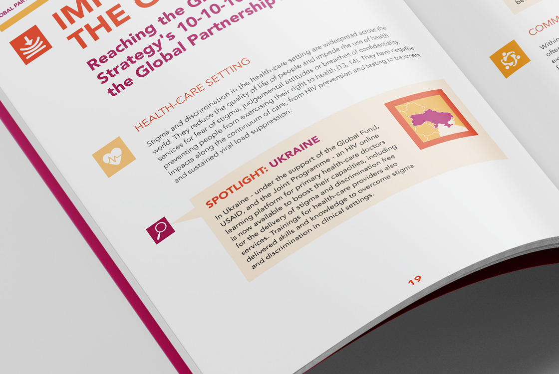 The Global Partnership to Eliminate All Forms of HIV-Related Stigma and Discrimination is an initiative of 10 UN agencies and 24 civil society organizations. We were approached with the task of creating a small visual identity that is based on the corporate identity of UNAIDS, but still has its original and recognizable character. The initiative does not use its own logo because it operates under UNAIDS, instead of the logo it has a distinctive Wordmark. The entire identity is built on playful and bold geometric compositions and 3 positive colors. Our studio also produced three publications in several world languages.