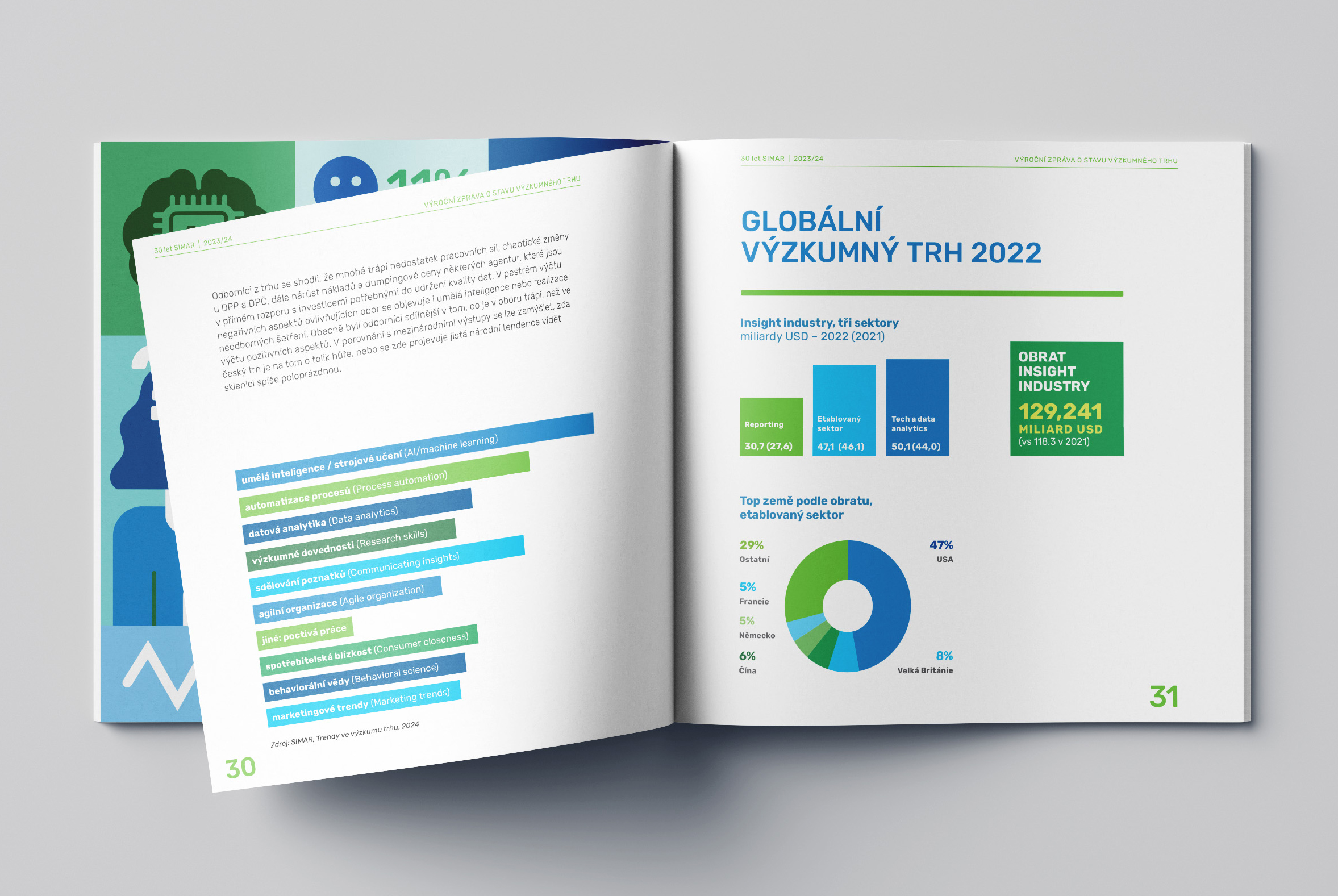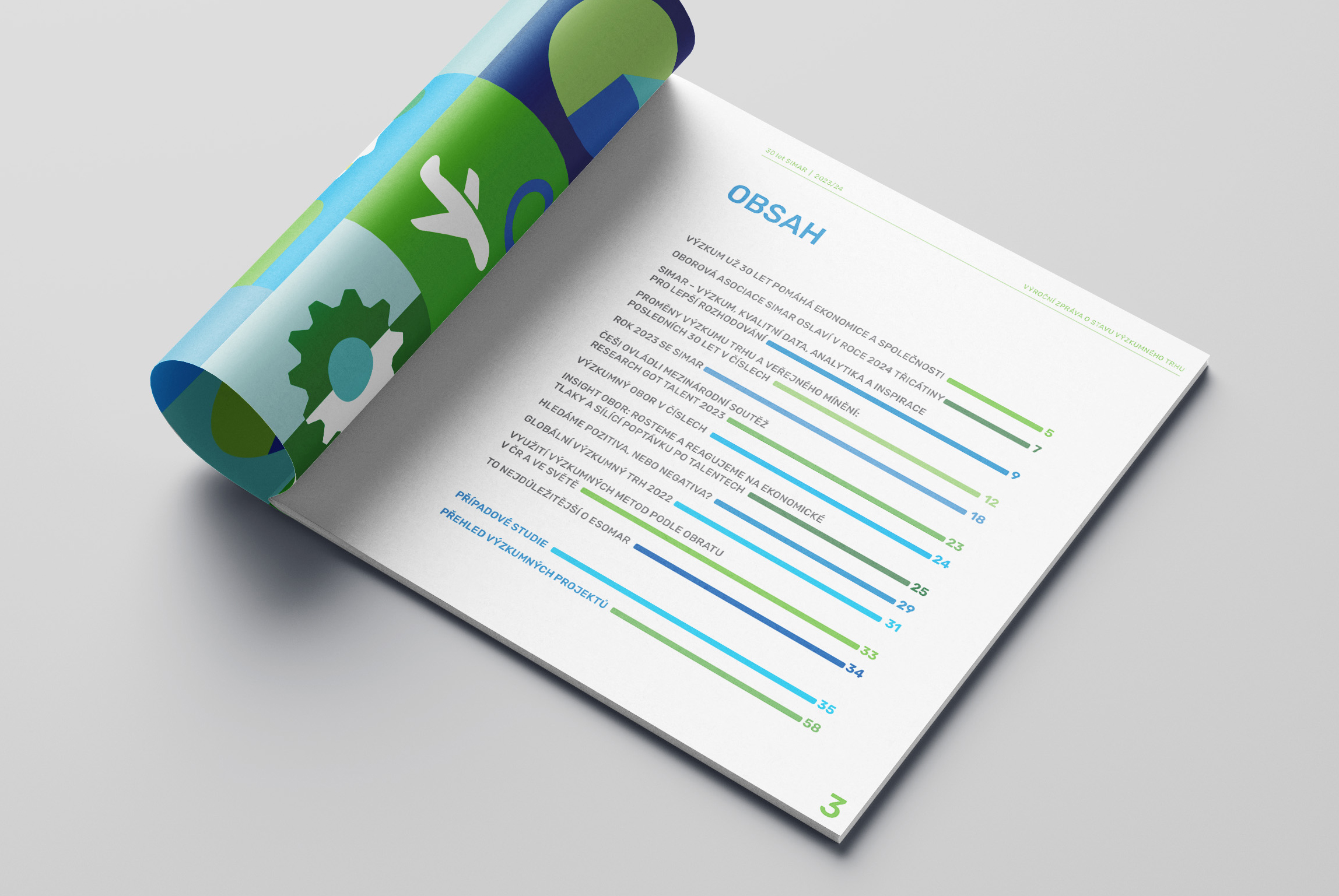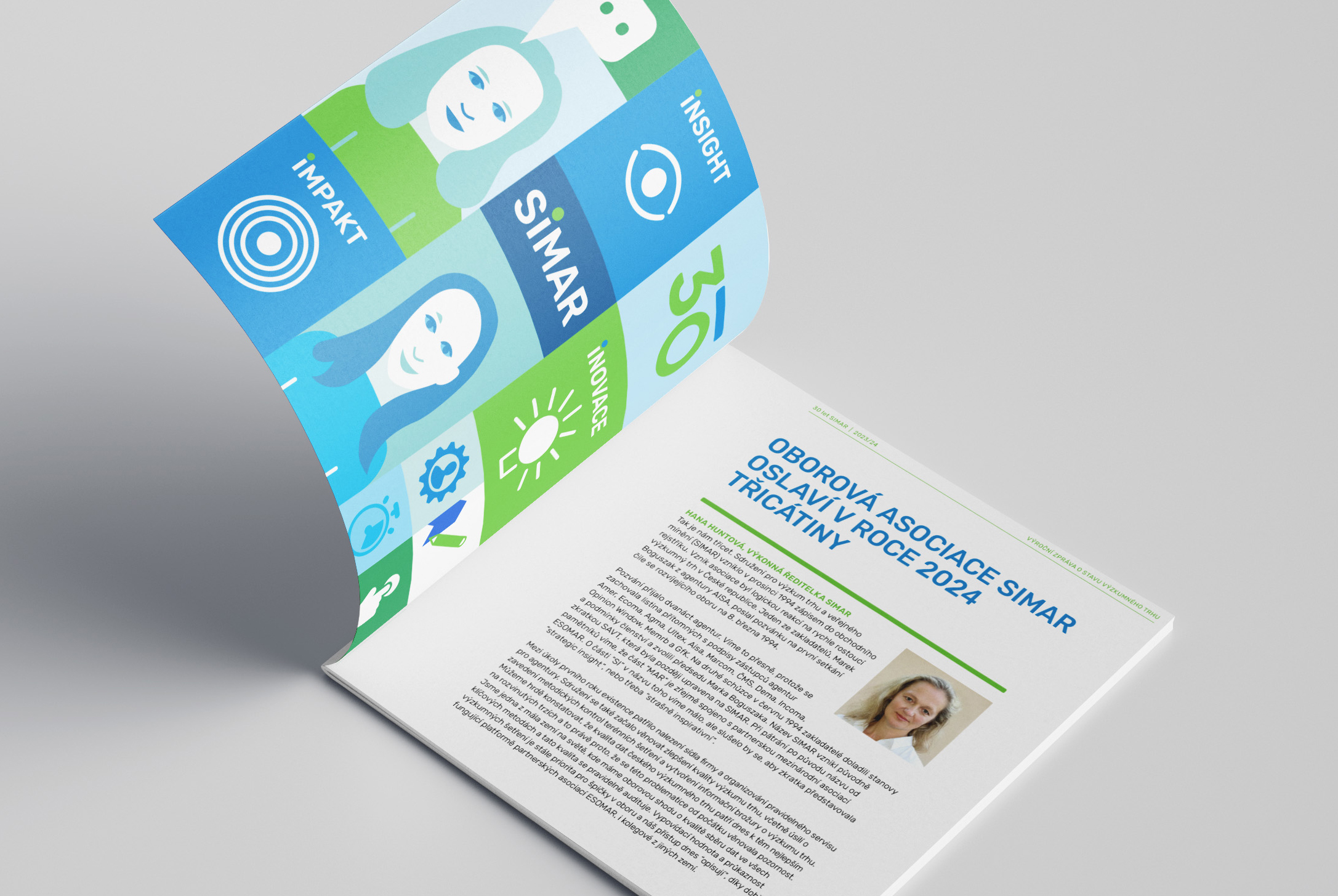 SIMAR ("Association of Market and Public Opinion Research Agencies," based in Prague) celebrated its 30th anniversary in 2024. On this occasion, we created a special anniversary logo, a small social media campaign, an annual report with case studies of the most interesting research affecting events in Czech society, and promotional materials for an event in the Chamber of Deputies. The unique feature of this corporate identity is the custom-made illustrations, as the very specific topics of the research make stock photos inappropriate.